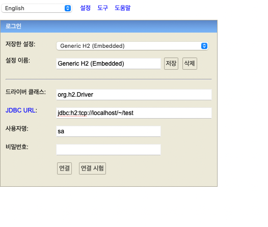 JDBC URL은 현재 파일의 경로를 말해줌 (home에 있는 test파일)