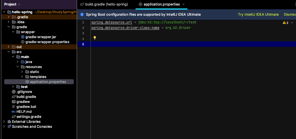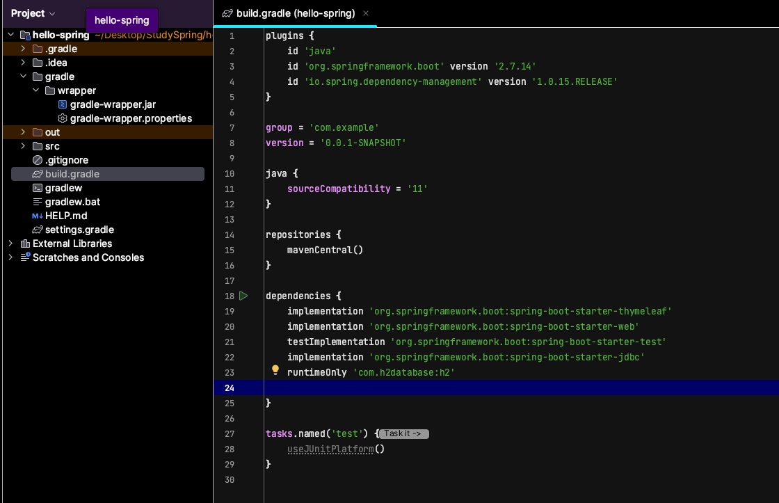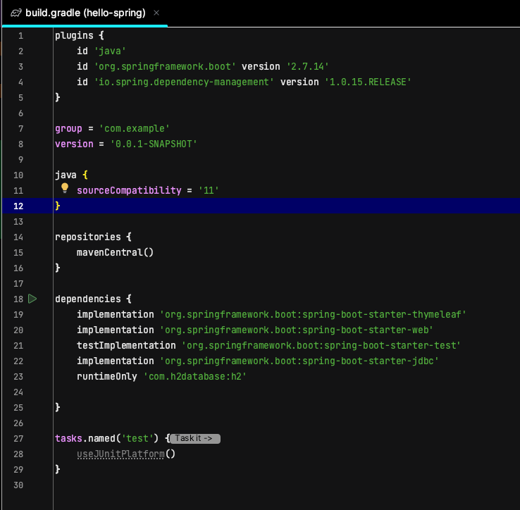 - 환경설정 : build.gradle 파일에 JDBC, h2 데이터베이스 관련 라이브러리 추가