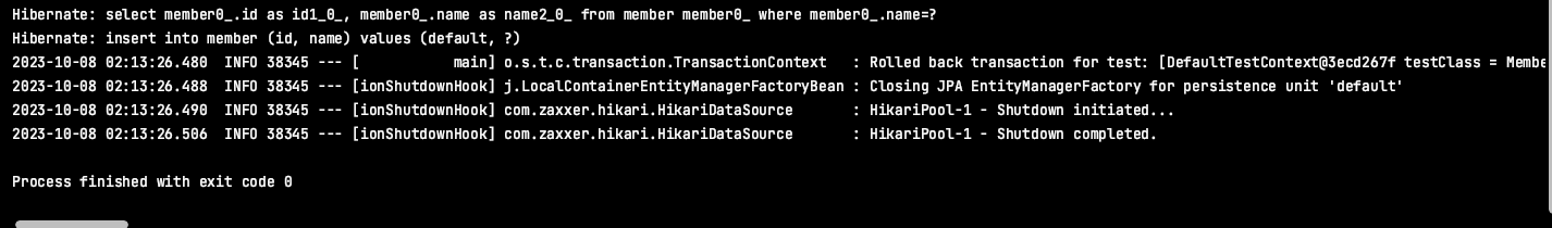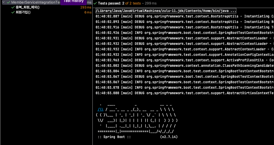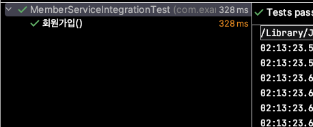 그 후 테스트를 실행 (해당 사항은 고쳐줄 필요가 X 왜냐하면 이미 연결 되어있는 상태 에서 JdbcTemplate으로 바꿔준것이기 때문에)