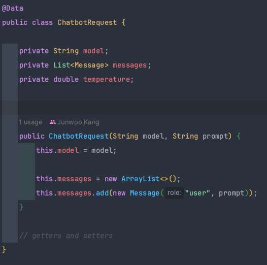ChatbotRequest request = new ChatbotRequest(model, prompt);