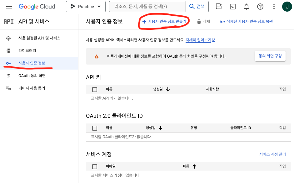 - 사용자 인증 정보 페이지에서 +사용자 인증 정보 만들기 선택