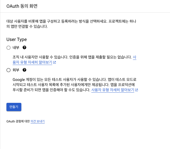 - 메뉴바에서 OAuth 동의 화면 선택