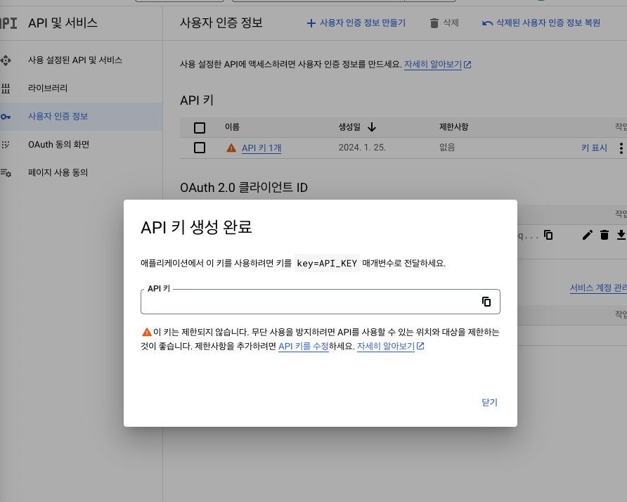 - 구글 콘솔 클라우드에서 API 및 서비스로 이동