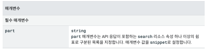- https://developers.google.com/youtube/v3/docs/search/list?hl=ko