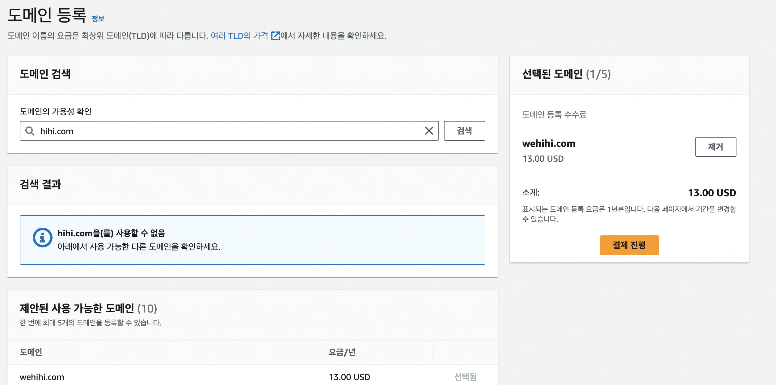 - 선택 된 도메인을 확인 하고 결제 진행 선택