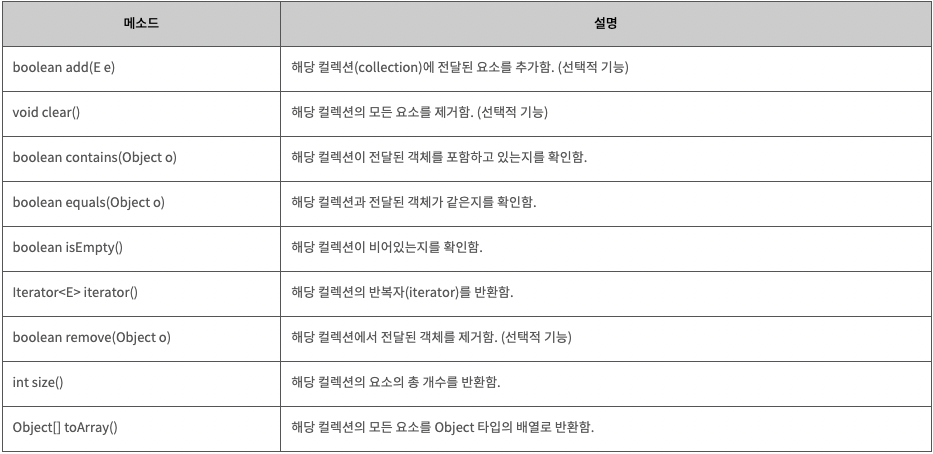- 리스트(List) : 순서가 있는 데이터의 집합으로, 데이터의 중복을 허용하는 인터페이스