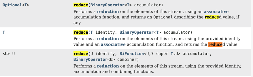 - 위의 코드의 결과 값과 공식문서 발췌 한것을 확인 해보면 reduce 연산에서 Optional<T> 의 결과를 반환하는 것을 알 수 있다.