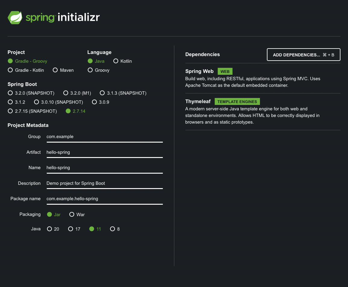 Dependencies 는 Spring Web 과 Tymeleaf(뷰 템플릿, html 태그를 기반으로 한다고 함)을 추가