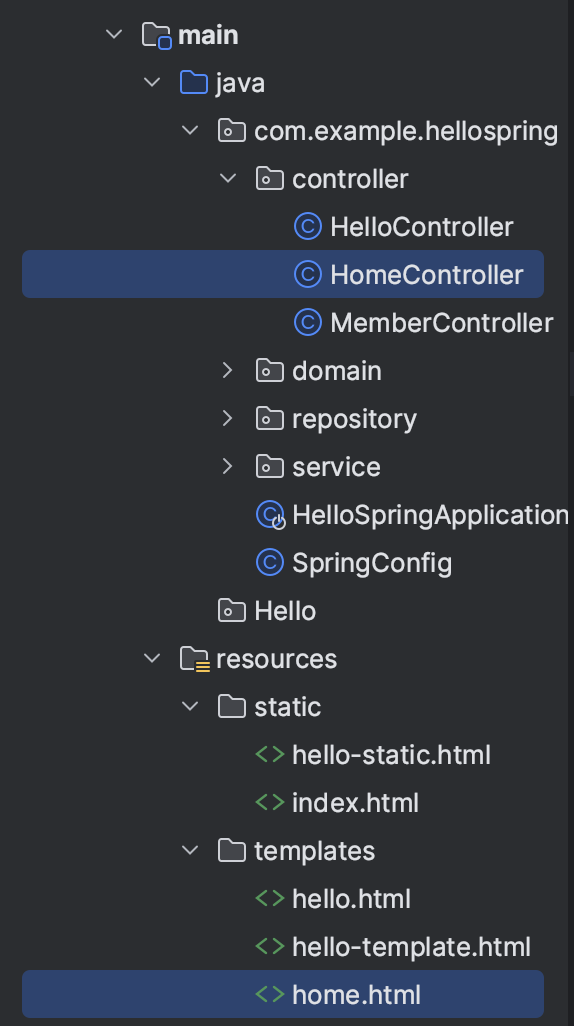 - [Remind] 웹브라우저에서 요청이 올때 스프링 내장 톰켓서버에서 스프링 컨테이너에 존재하는지 관련 Controller가 있는지 확인 후 Mapping 혹은 정적으로 반환! 이 경우 Controller를 Mapping 해주었기 때문에 우리가 원하는 home.html파일이 반환 되었음