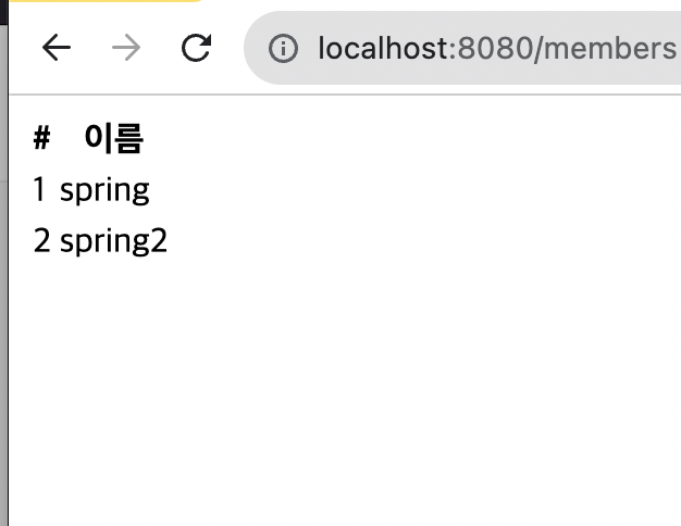 위 코드를 통해 members/new에서 받은 데이터를 List로 생성한 Repository에 넣어주고 그 다음 그 데이터를 /members에서 보여준다.